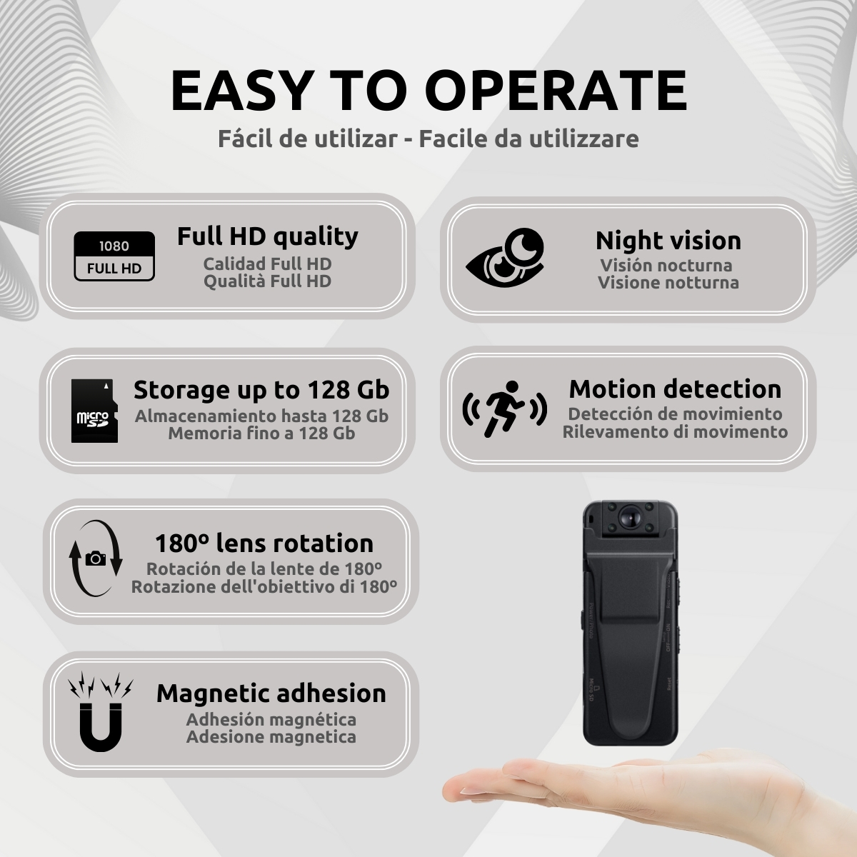 La Cámara Espía Coche Full HD es el dispositivo perfecto para quienes buscan vigilancia discreta y eficiente dentro del vehículo. Gracias a su diseño compacto y funcional, puede colocarse en cualquier parte del coche sin llamar la atención, ya que tiene adhesión magnética, convirtiéndose en una herramienta ideal para monitoreo encubierto o seguridad vial.