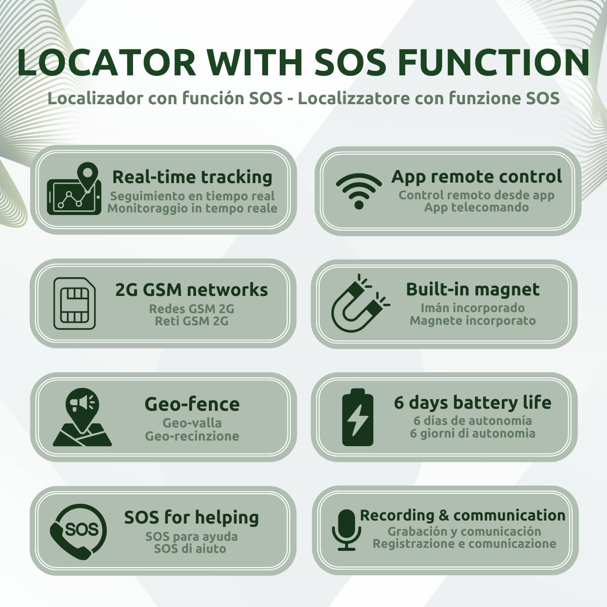 El imán incorporado facilita la instalación del localizador en cualquier superficie metálica, permitiéndote colocarlo discretamente en vehículos, mochilas o maleteros sin complicaciones. Además, incluye una función SOS, que permite al usuario enviar una señal de emergencia en caso de necesitar ayuda, activando alertas inmediatas para que puedas actuar rápidamente.