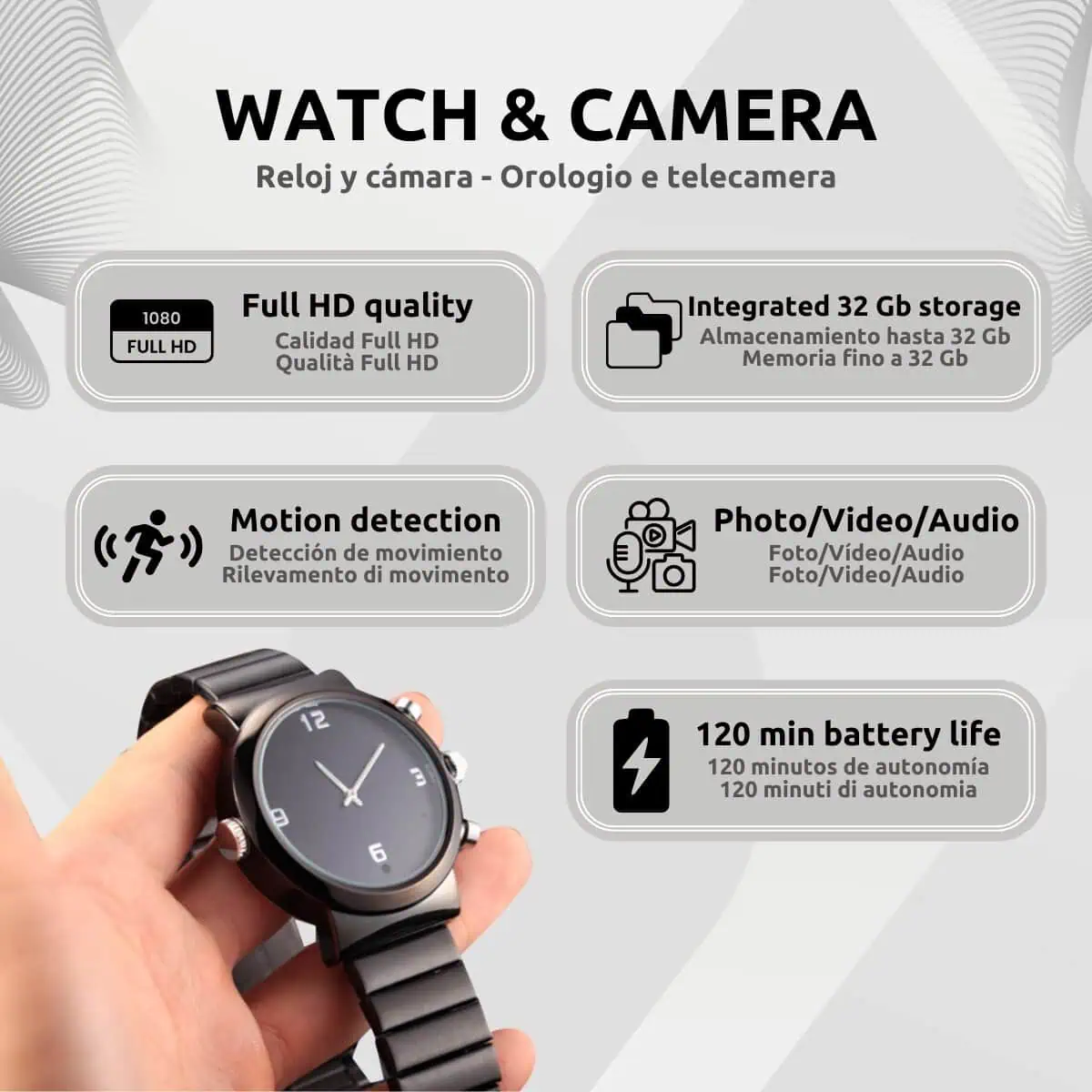 Reloj espía Full HD con 32GB de memoria interna y detección de movimiento. Ideal para grabar discretamente en cualquier situación.